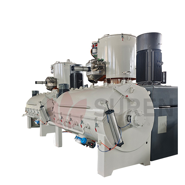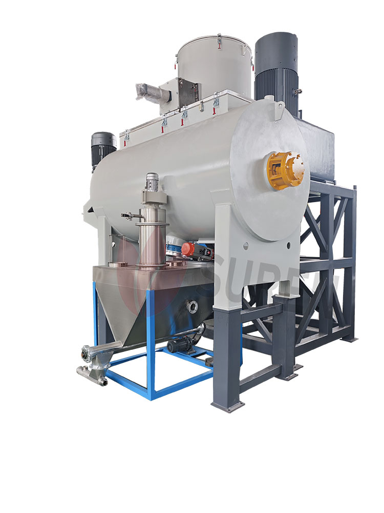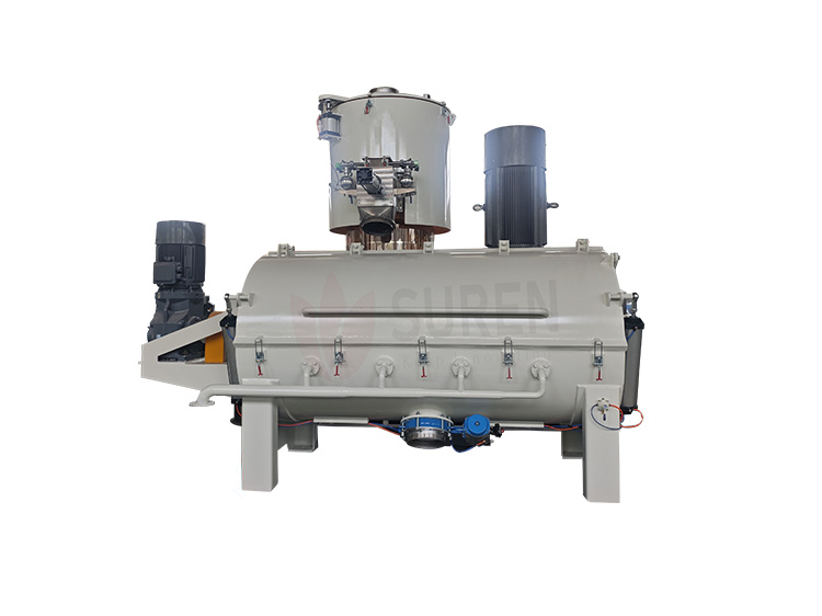 SRL-W系列卧式混合机组 技术特点与优势 冷混机内壁及底部均为SUS304不锈钢材料,桨叶则是ZG1Cr18Ni9Ti 不锈钢,且经过抛光处理.盖子由气动打开,物料通过水循环冷却,主轴依靠深槽球轴承运行,保证了稳定可靠安全.